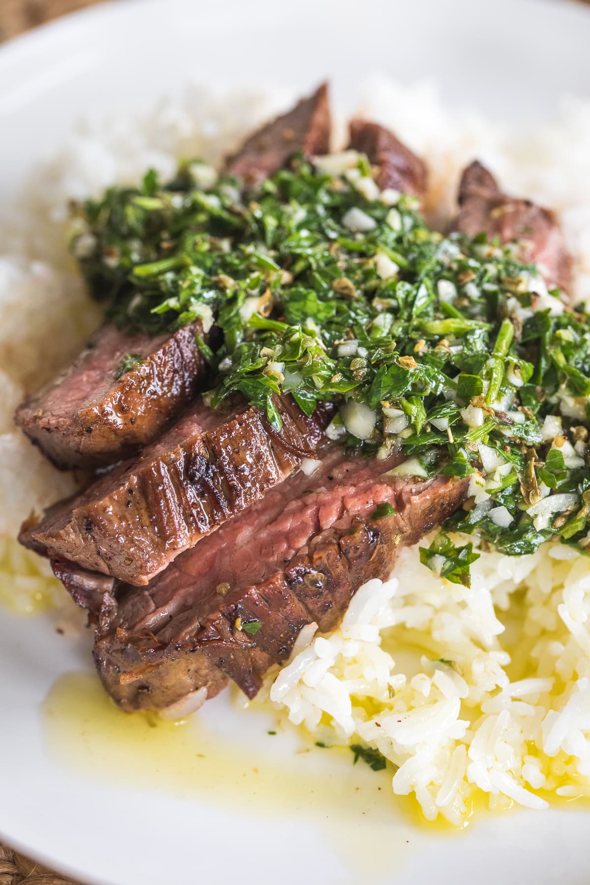 Grilled steak, parsley, garlic, olive oil, red wine vinegar, rice, roasted vegetables (contains: none/ gluten-free)